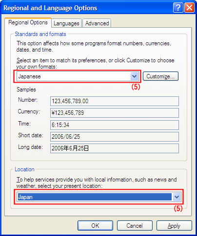 Standards and formats から Japanese を、 Location から Japan 選択。(5)